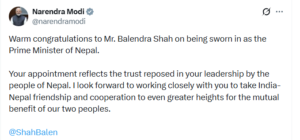 नई दिल्ली: प्रधानमंत्री नरेंद्र मोदी ने बालेंद्र शाह को नेपाल के प्रधानमंत्री के रूप में शपथ लेने पर बधाई दी। पीएम मोदी ने ट्वीट कर कहा कि वह उनके नेतृत्व में नेपाल और भारत के बीच मजबूत और सकारात्मक संबंधों की कामना करते हैं।