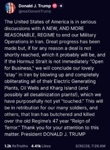 ट्रम्प ने चेतावनी दी कि अगर समझौता नहीं हुआ और हॉर्मुज़ की खाड़ी को खोलने में असफलता रही, तो अमेरिका ईरान के सभी विद्युत उत्पादन संयंत्रों, तेल कुओं और खार्ग द्वीप (Kharg Island) को पूरी तरह नष्ट कर देगा। इसके साथ ही उन्होंने कहा कि संभव है कि देश के सभी पानी शोधन (desalination) संयंत्रों को भी निशाना बनाया जाए।